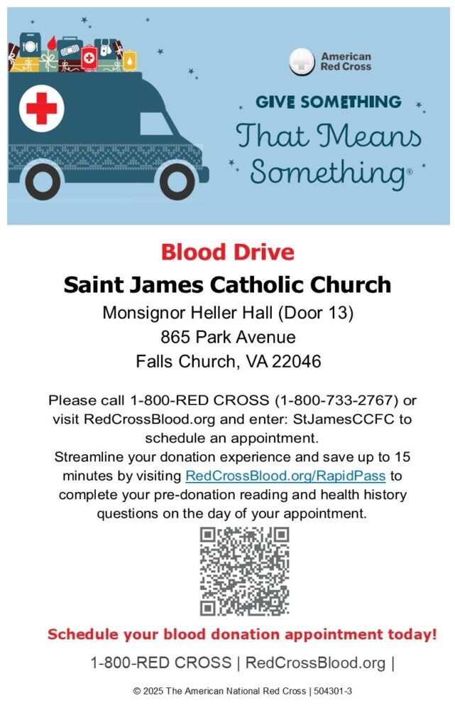 Call 1-800-RED-CROSS or visit RedCrossBlood.org (or scan QR code) and enter: StJamesCCFC.