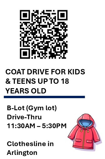 Children and Youth Coat Drive – Please donate only new coats for kids and teens (up to age 18). Coats will be donated to Clothesline in Arlington.