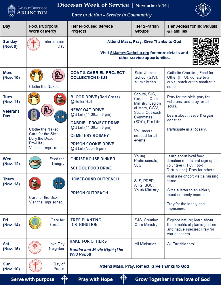 Bishop Burbidge invites all members of our diocese to participate in the inaugural Arlington Diocese Week of Service from November 9-16, 2025. The theme is “Love in Action – Service in Community”. Coming soon, the Saint James Diocesan Service Week Committee will be sharing planned events during this week in November for parishioners to participate in individually or as a family.