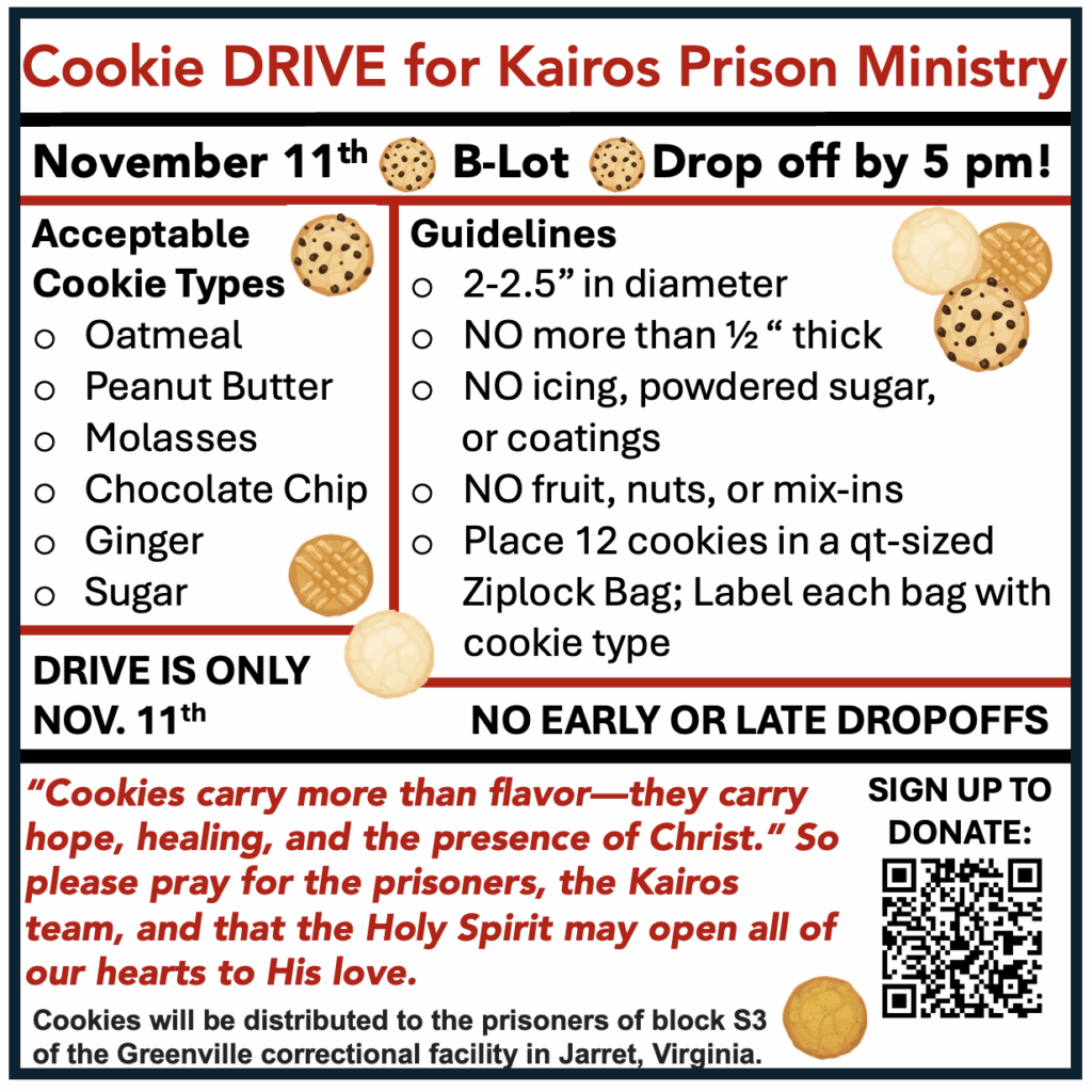 As part of our Diocesan Week of Service and carrying out the Corporal Works of Mercy, we are supporting the Kairos Prison Ministry. We are asking volunteers to provide at least 1 dozen cookies for donation. These cookies will be will be distributed to the male prisoners of block S3 of the Greenville correctional facility in Jarret, Virginia. You can definitely make more. The ministry would like a tally so we are asking all volunteers who want to donate cookies to sign up in advance.