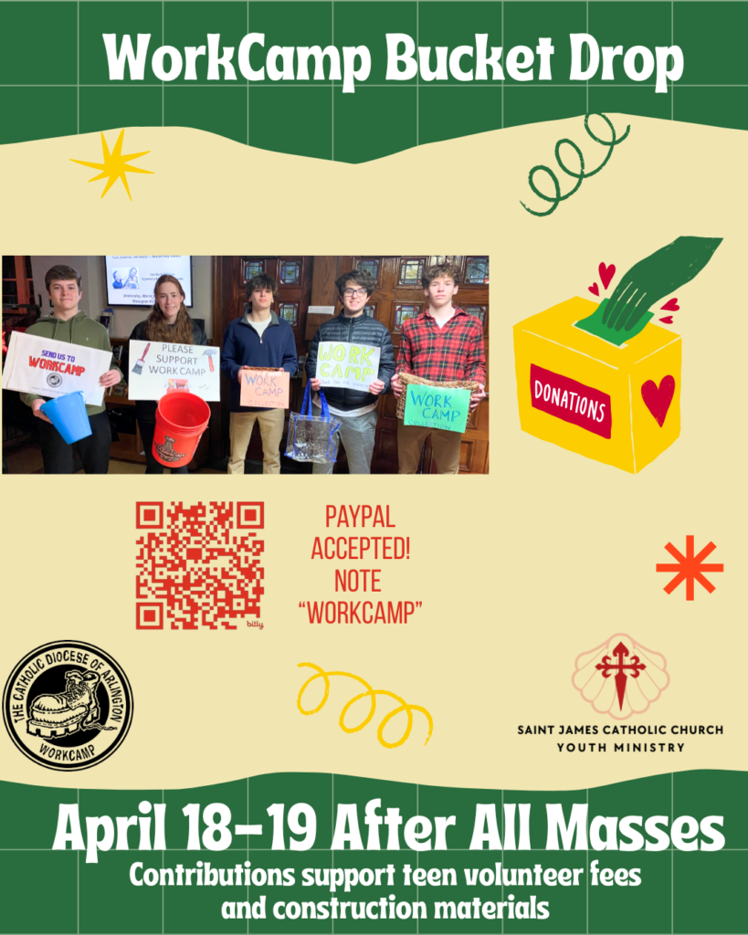 | Our WorkCamp crew will have a Bucket Drop after each Mass on Saturday, April 18th and Sunday, April 19th. The crew will be collecting donations which will be used to help cover the student cost as well as for the construction costs incurred to help with the home repairs during WorkCamp week. We appreciate your donations and prayers as our teens prepare for WorkCamp in June. Donations can also be made via check to Saint James Catholic Church or online via our PayPal account, https://www.paypal.com/paypalme/stjamescatholic. Please note “WORKCAMP” for both. Thank you in advance for your support! |