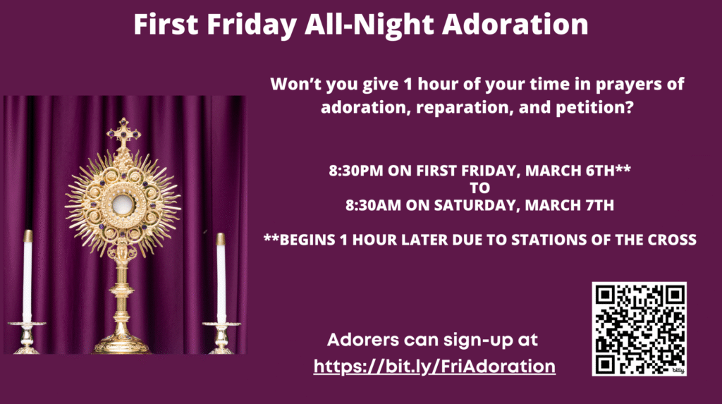 First Friday All-Night Adoration will begin on March 6th at 8:30pm (vs. 7:30pm) due to Stations of the Cross and end Saturday, March 7th, morning before the 8:30am Mass.