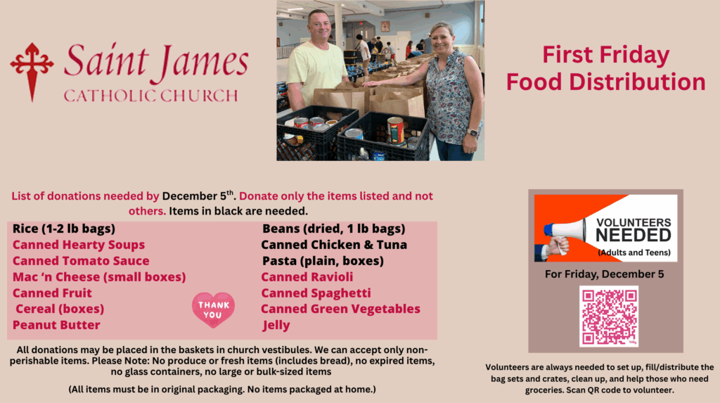 Our monthly, Friday evening Food Distribution serves needy families from 5:30 pm-6:30 pm, on the first Friday of the month. For Food Distribution recipients please do not park in A Lot (by Monsignor Heller Hall), B Lot (Knecht Gym), or C Lot (Behind the school) from 2:30 pm-4:30 pm. Parking before 4:30 pm causes problems for the school and will also hinder food distribution.
