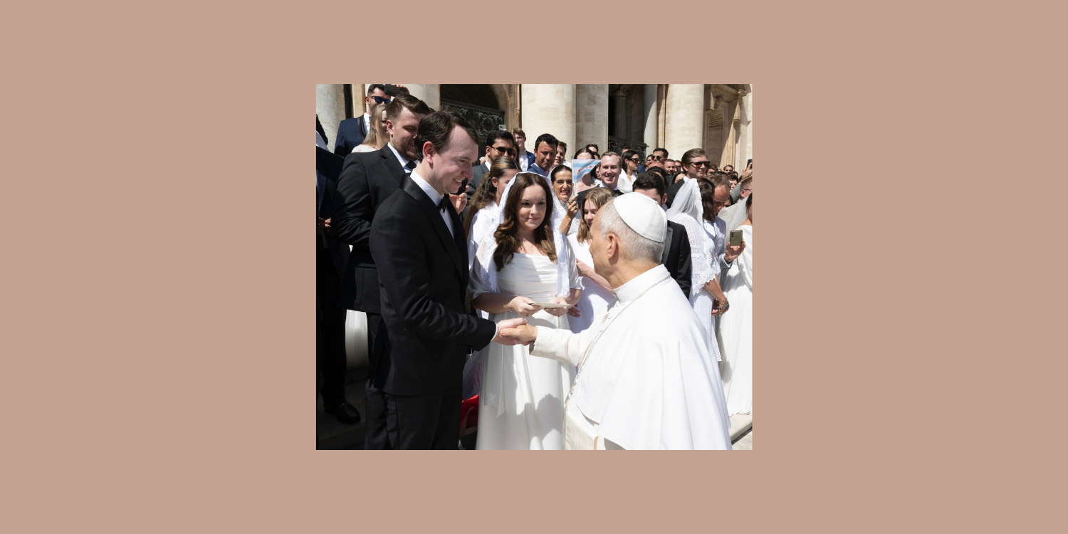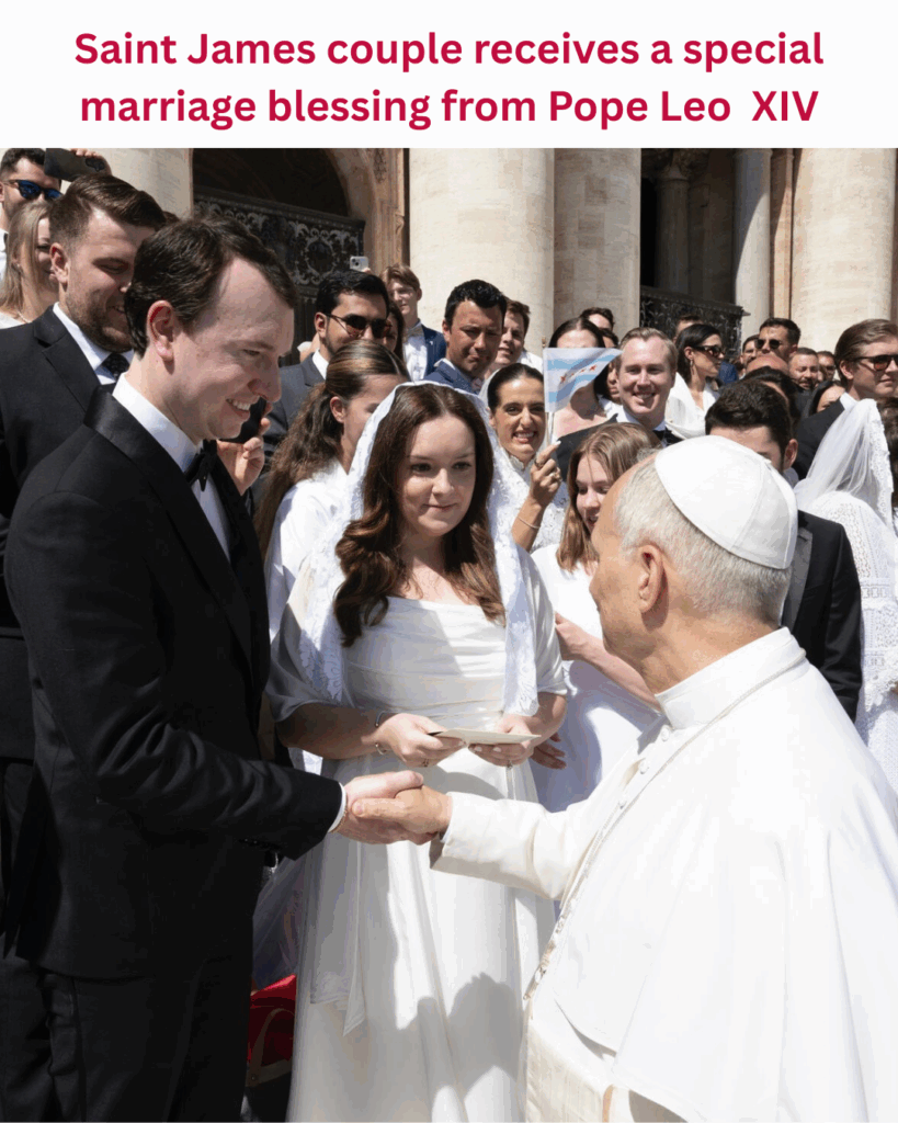 Earlier this month parishioners Andrew and Megan Ronnfeldt received a special marriage blessing from Pope Leo XIV just ahead of their first wedding anniversary. They were married at Saint James last September. The blessing took place at Saint Peter’s on September 3rd. Megan, a proud U.S. Navy veteran and graduate of the U.S. Naval Academy, presented Pope Leo with a U.S. Navy coin as well as one of our brand new Saint James Catholic Church car magnets!