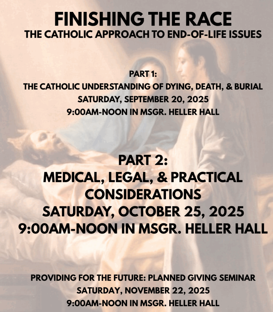 This fall our parish is sponsoring a three-part series on end-of-life issues. What’s the Catholic understanding of death? What are the moral, medical, and legal implications? How does one plan for a funeral? How can we provide for those who survive us?