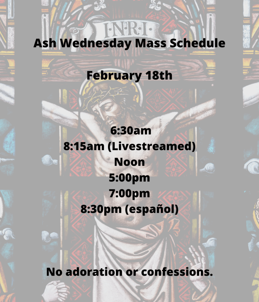 Please make a concerted effort to attend one of these Masses to prepare yourself for the season. Confession and Adoration are suspended due to Ash Wednesday Masses.