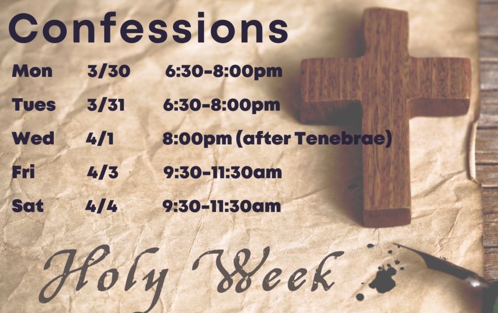 See Holy Week schedule on this page for the Confessions schedule during Holy Week.