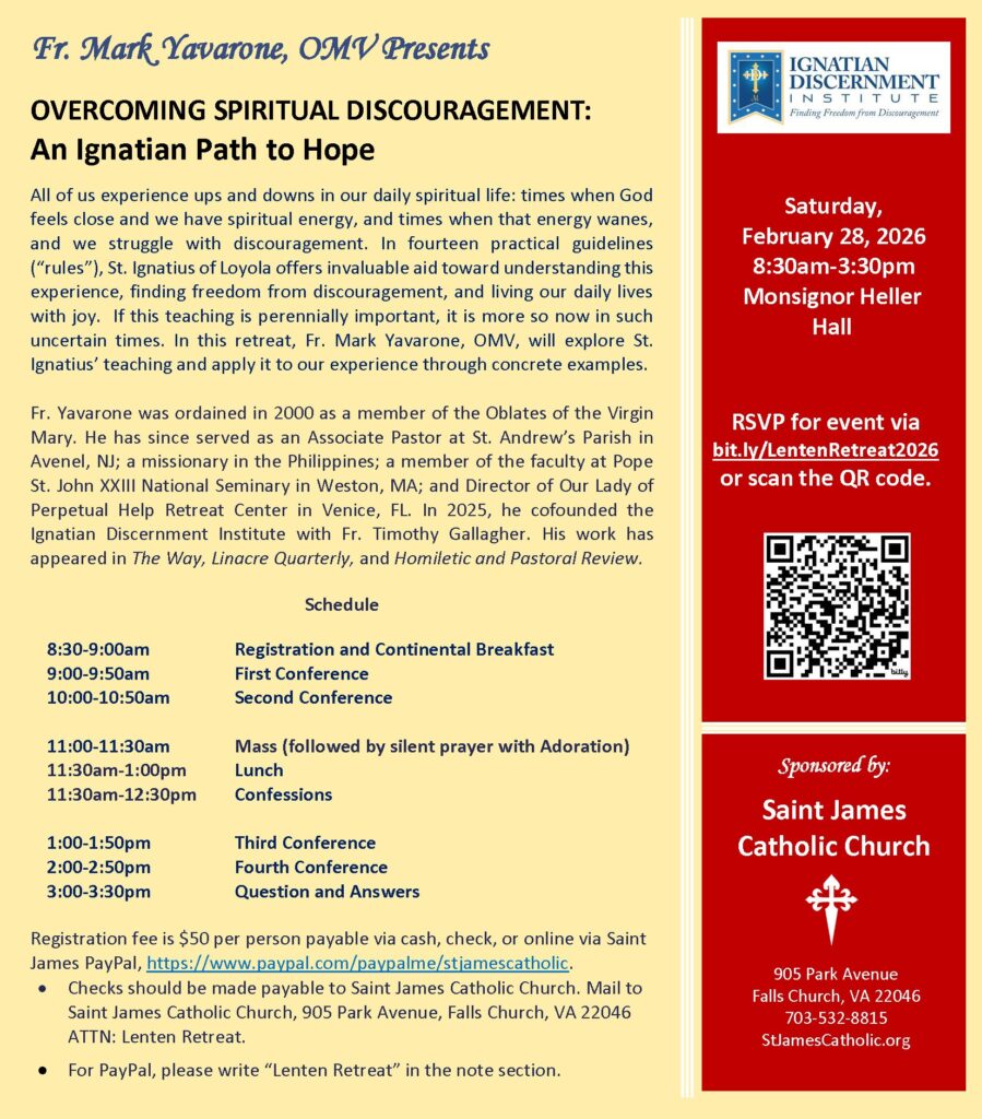 This year we will have one Lenten Retreat for the entire parish on Saturday, February 28, 2026, 8:30am-3:30pm in Monsignor Heller Hall. Registration is required. To RSVP for this Lenten retreat, visit bit.ly/LentenRetreat2026 with Fr. Mark Yavarone, OMV, or scan the QR code. If you have any problems with the link, email [email protected].