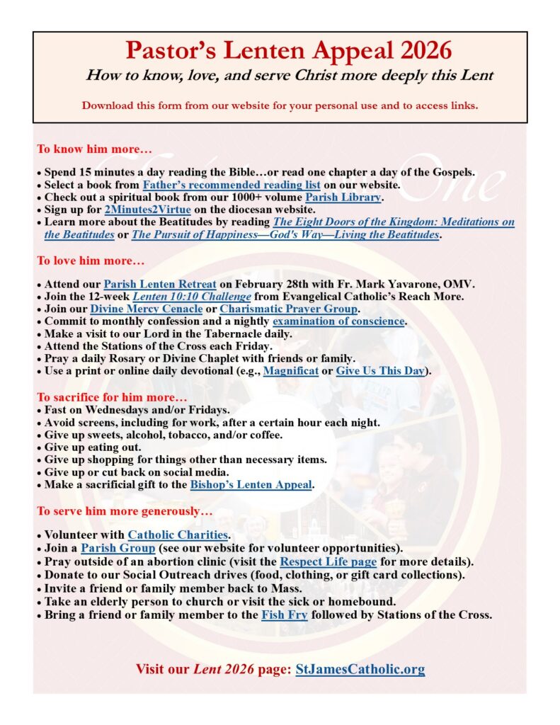 Below the Pastor’s Lenten Appeal for 2026. Please note, the links in the picture will not be clickable. Click here to download the PDF file that will allow you to access the links in the picture below.